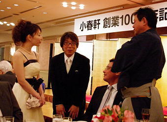 | 三代目によるあいさつをやさしく見守るおかみ! 「・・・先代はまさか100年続くとは思ってなかったでしょうね。 朝起きて、ジャガイモと人参をゆでて家内がサラダをつくって、私がコロッケをつくる そんな毎日でここまでやってきました・・・」 矢田区長は40年来の友人としてあいさつ。 「笑顔で迎えてくれる小春軒さんは、家庭的で入りやすくてほんとにあったかい店ですよね。 僕は、かじきバター(通称バタカジ)が大好きなんです・・・」 | ||