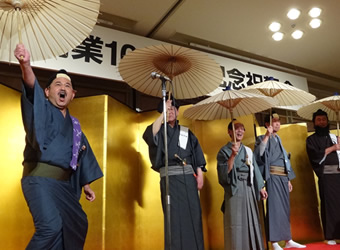 | 久松料飲組合 三田組合長によるあいさつ 「代々続けていくのはほんとになかなか難しい・・・しかも100年ですからね」 ・・・とにかくめでたい!沢の鶴で鏡割り。 | ||