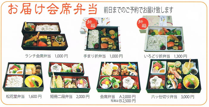 [lunch] Japanese lunch box (only for 15 people): JPY1000- sashimi set with rice, miso soup and salad: JPY980- Tempura set with rice, miso soup and salad: JPY980- grilled fish set with rice, miso soup and salad: JPY880- small rice bowl topped with tempura &Udon (Japanese noodle) : JPY850- small rice bowl topped with chopped tuna sashimi &Udon (Japanese noodle) : JPY850- [dinner] assorted sashimi (6 kinds): JPY1280- or more tuna sashimi: JPY980- Caesar's salad: JPY880- Omlet Japanese style using organic eggs: JPY480- home-made tofu in a basket: JPY480- grilled Taraba crab: JPY1280- course menu: JPY5000- or more bottomless cup of drinks incl. dishes: JPY5500- or more |